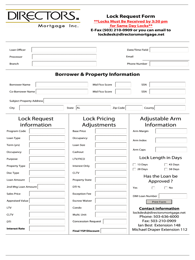 Lock Request Form **Locks Must Be Received by 3:30 pm for Same Day Locks** Fax (503× 2100909, or you can email to lock desk directors mortgage.net Loan Officer Date×Time Field Processor Email Branch