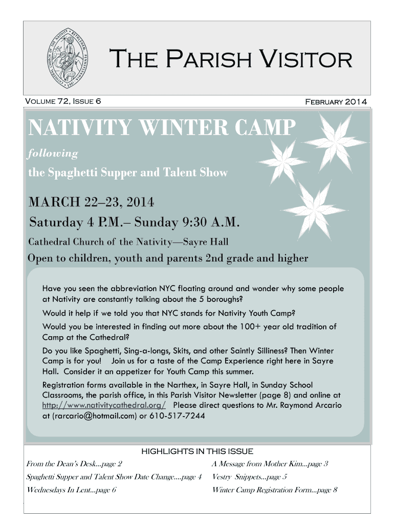 THE PARISH VISITOR FEBRUARY 2014 NATIVITY WINTER CAMP following the Spaghetti Supper and Talent Show MARCH 2223, 2014 Saturday 4 P. M. Sunday 9:30 A.M. Cathedral Church of the NativitySayre Hall Open