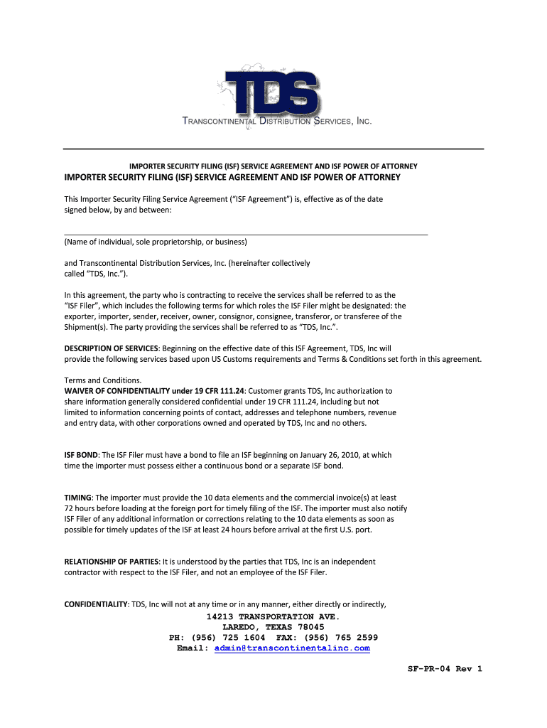 IMPORTER SECURITY FILING (ISF) SERVICE AGREEMENT AND ISF POWER OF ATTORNEY IMPORTER SECURITY FILING (ISF) SERVICE AGREEMENT AND ISF POWER OF ATTORNEY This Importer Security Filing Service Agreement
