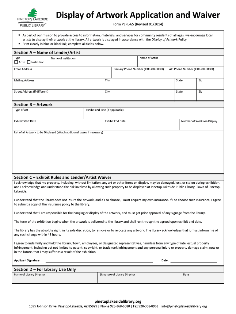 Get the free Display of Artwork Application and Waiver - pinetoplakesidelibrary