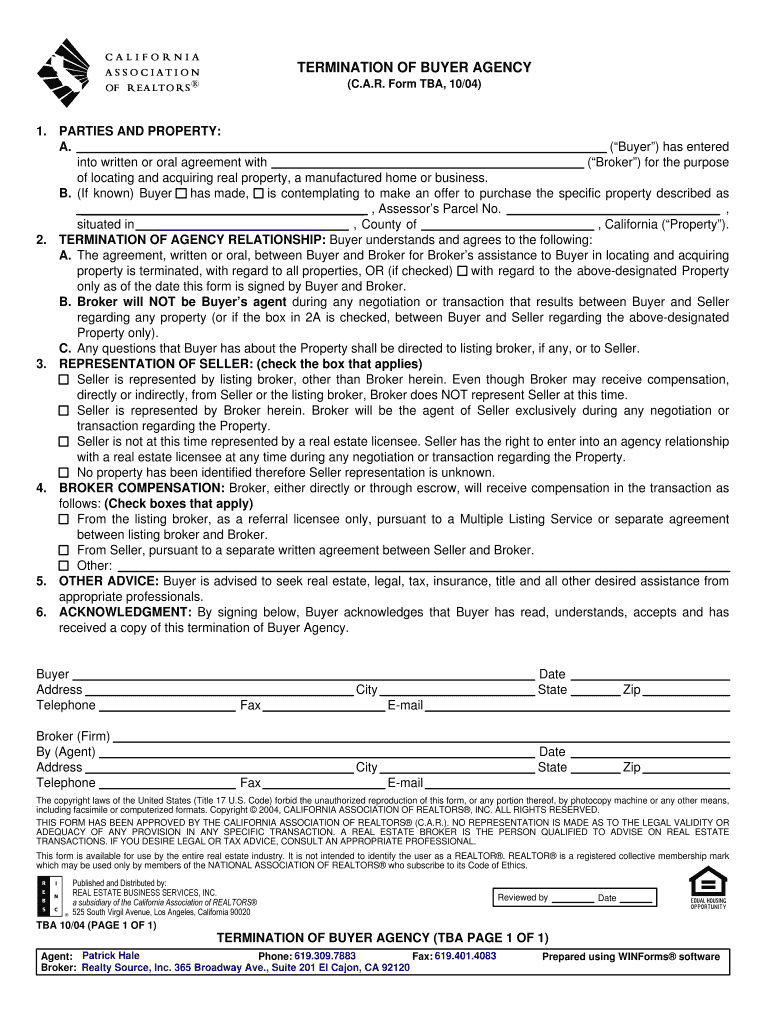TERMINATION OF BUYER AGENCY (C.A.R. Form TBA, 10/04)1. PARTIES AND PROPERTY: A. (Buyer) has entered into written or oral agreement with (Broker) for the purpose of locating and acquiring real property,