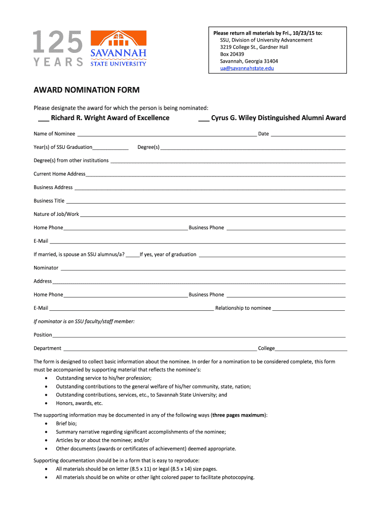 Please return all materials by Fri., 10×23/15 to: SSR, Division of University Advancement 3219 College St., Gardner Hall Box 20439 Savannah, Georgia 31404 UA savannahstate.edu AWARD NOMINATION FORM