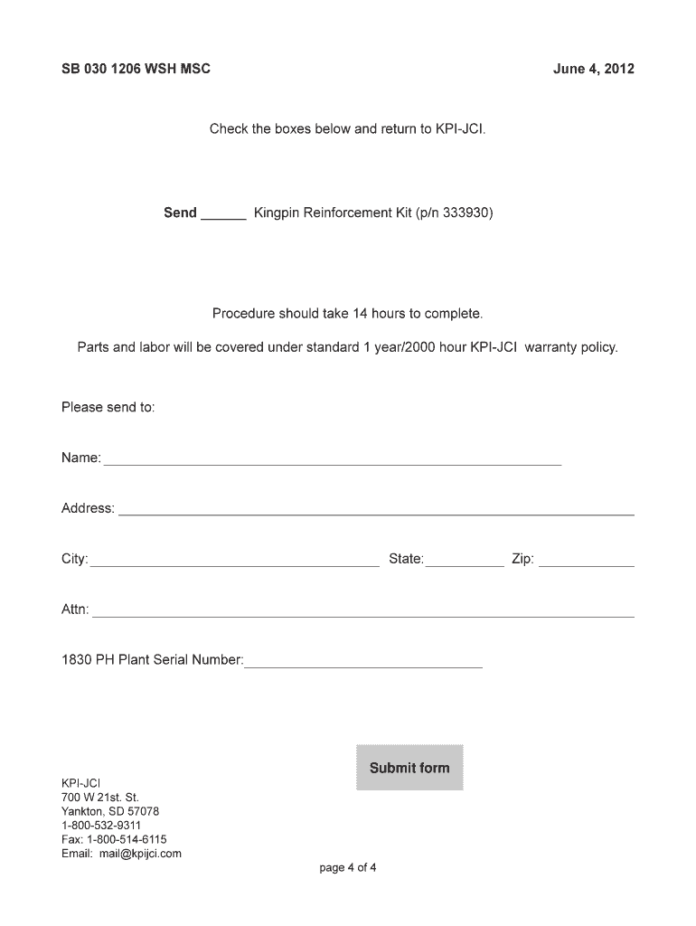 SB 030 1206 WISH MSC June 4, 2012, Service Bulletin Model 1830 PH Plants Serial Numbers 410656, 410883, 411789, 411800, 411807, 411869, 411872 SB 030 1206 WISH MSC June 4, 2012, SUBJECT: Model 1830