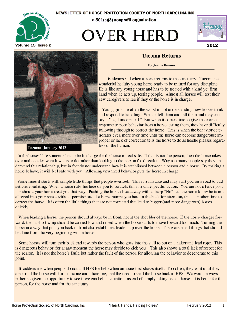 NEWSLETTER OF HORSE PROTECTION SOCIETY OF NORTH CAROLINA INC a 501×c)(3) nonprofit organization Volume 15 Issue 2 OVER HERD 2012 Tacoma Returns By Joanne Benson It is always sad when a horse returns