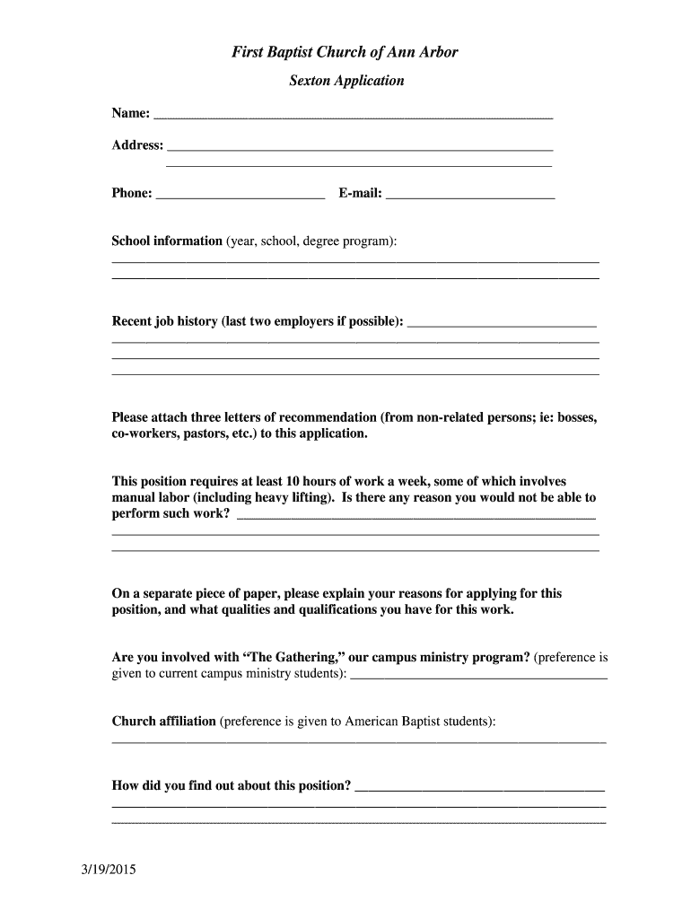 First Baptist Church of Ann Arbor Sexton Application Name: Address: Phone: Email: School information (year, school, degree program): Recent job history (last two employers if possible): Please attach