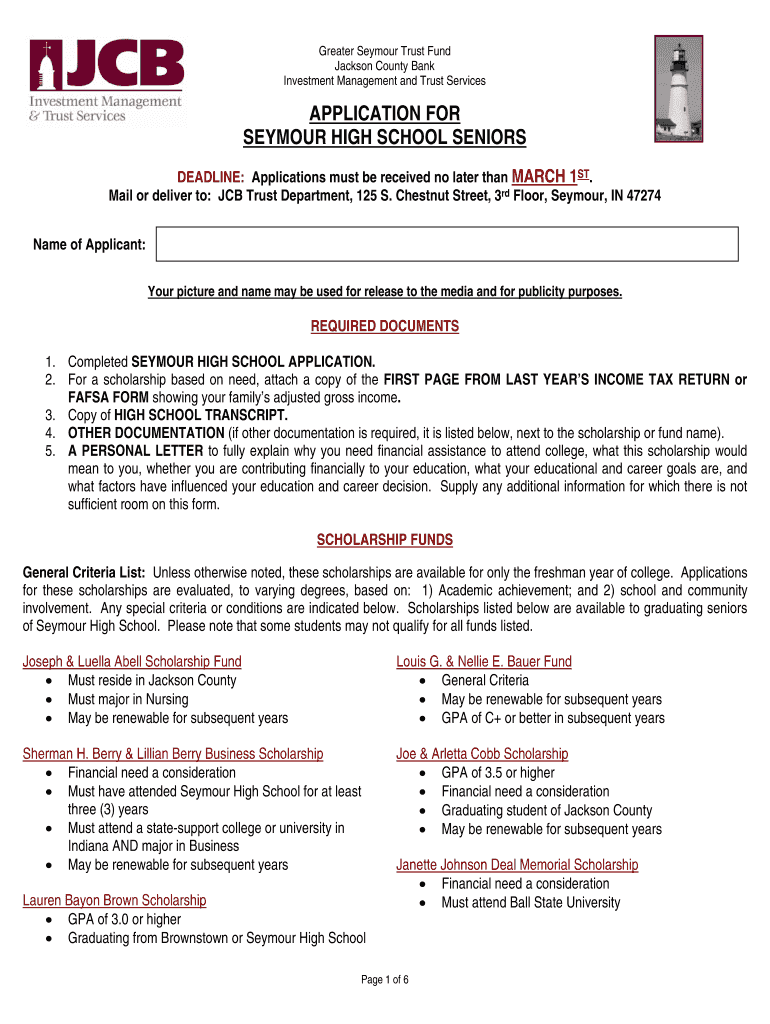 Greater Seymour Trust Fund Jackson County Bank Investment Management and Trust Services APPLICATION FOR SEYMOUR HIGH SCHOOL SENIORS DEADLINE: Applications must be received no later than MARCH 1ST.