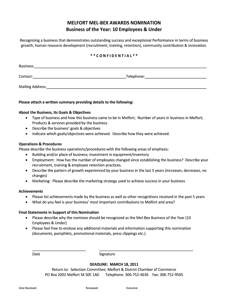 Get the free Nomination Form 226 Business of the Year Award 10 and Under - 2011
