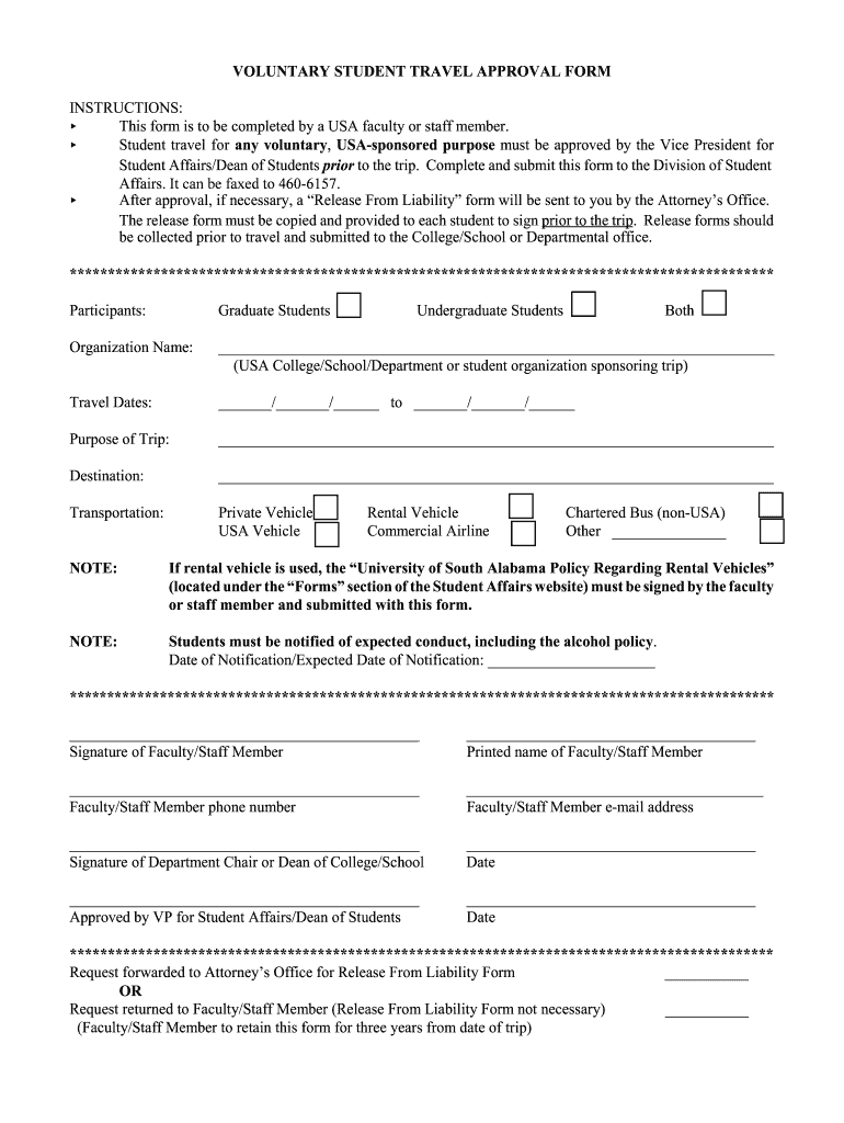 VOLUNTARY STUDENT TRAVEL APPROVAL FORM INSTRUCTIONS: This form is to be completed by a USA faculty or staff member. Student travel for any voluntary, USA sponsored purpose must be approved by the