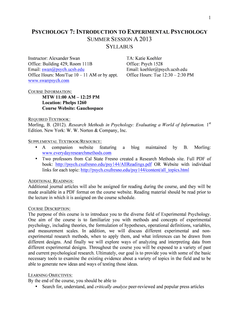 1PSYCHOLOGY 7: INTRODUCTION TO EXPERIMENTAL PSYCHOLOGY SUMMER SESSION A 2013 SYLLABUS Instructor: Alexander Swan Office: Building 429, Room 111B Email: swan psych.UCSB.edu Office Hours: Mon×Tue 10