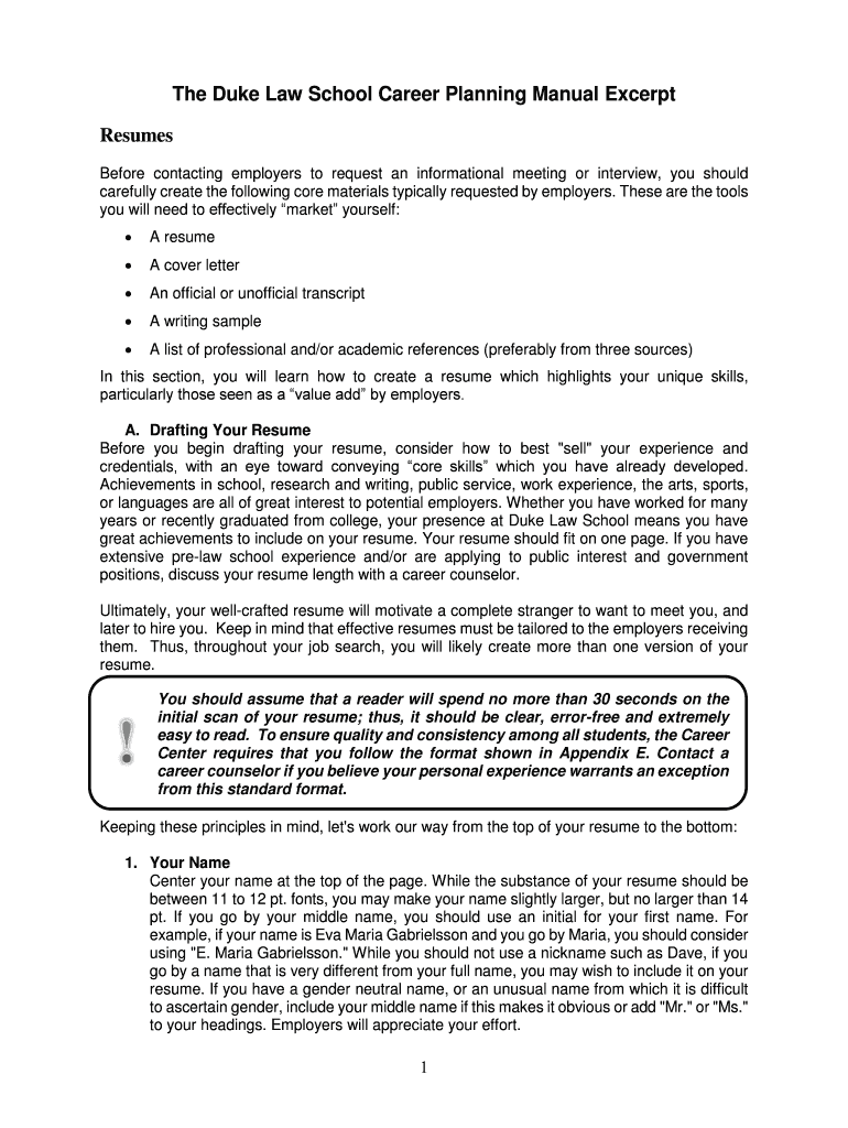 The Duke Law School Career Planning Manual Excerpt Resumes Before contacting employers to request an informational meeting or interview, you should carefully create the following core materials typically