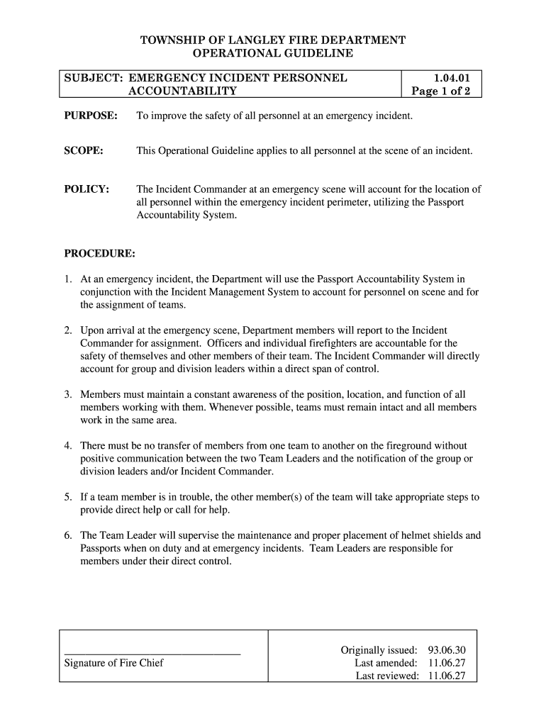 TOWNSHIP OF LANGLEY FIRE DEPARTMENT OPERATIONAL GUIDELINE SUBJECT: EMERGENCY INCIDENT PERSONNEL ACCOUNTABILITY 1.04.01-Page 1 of 2 PURPOSE: To improve the safety of all personnel at an emergency incident.