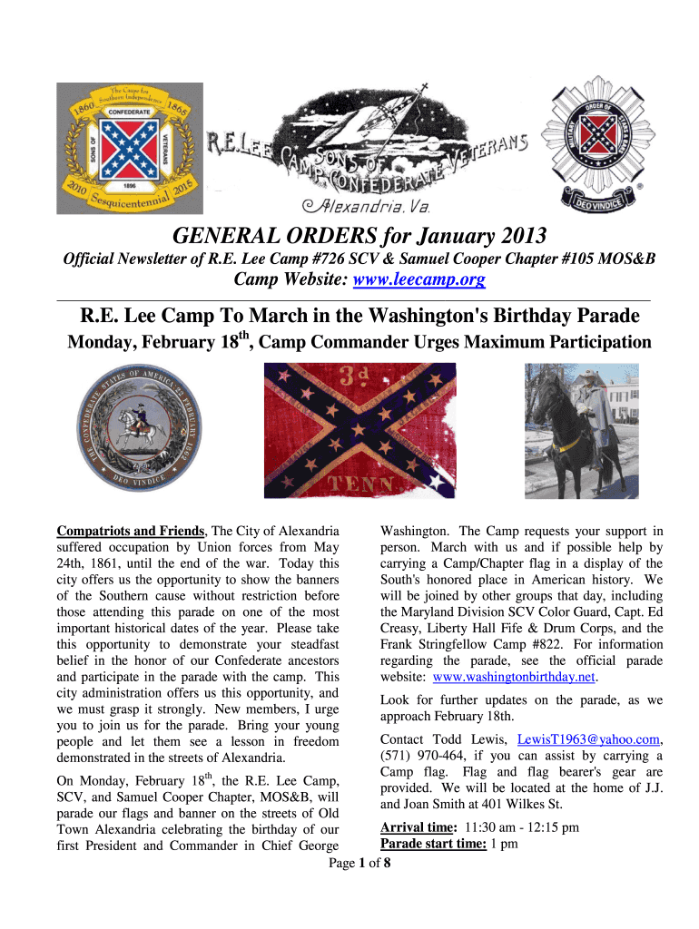 GENERAL ORDERS for January 2013 Official Newsletter of R.E. Lee Camp #726 SCV & Samuel Cooper Chapter #105 MOST Camp Website: www.leecamp.org R.E. Lee Camp To March in the Washington's Birthday Parade