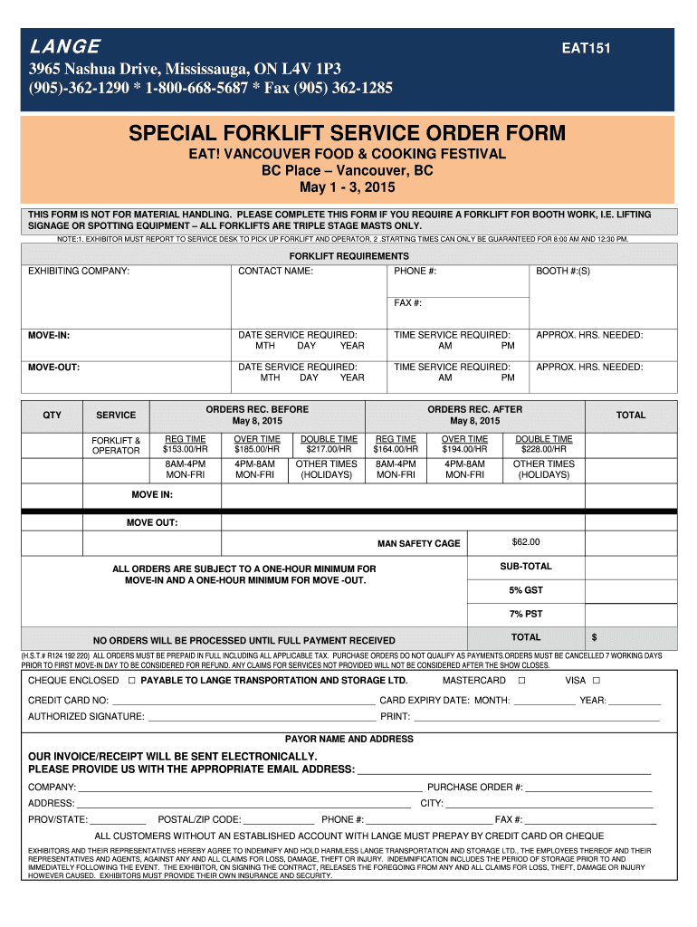 LARGE EAT151 3965 Nashua Drive, Mississauga, ON L4V 1P3 (905×3621290 × 18006685687 * Fax (905× 3621285 SPECIAL FORKLIFT SERVICE ORDER FORM EAT! VANCOUVER FOOD & COOKING FESTIVAL BC Place Vancouver,