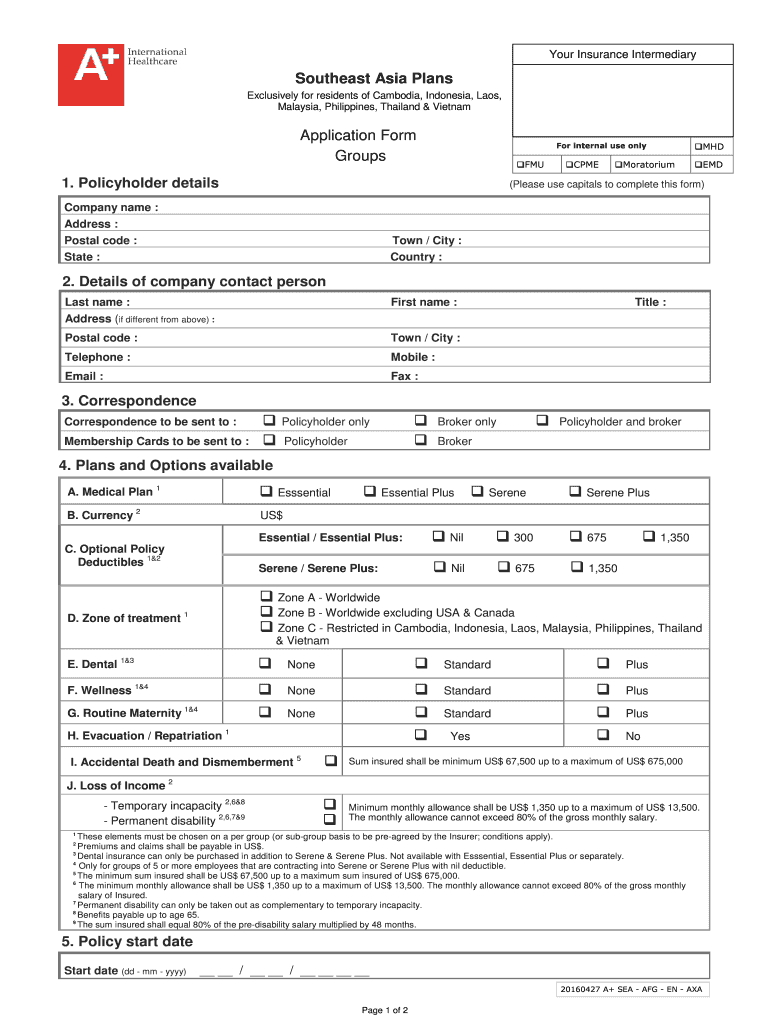 Your Insurance Intermediary Southeast Asia Plans Exclusively for residents of Cambodia, Indonesia, Laos, Malaysia, Philippines, Thailand & Vietnam Application Form Groups For internal use only FM