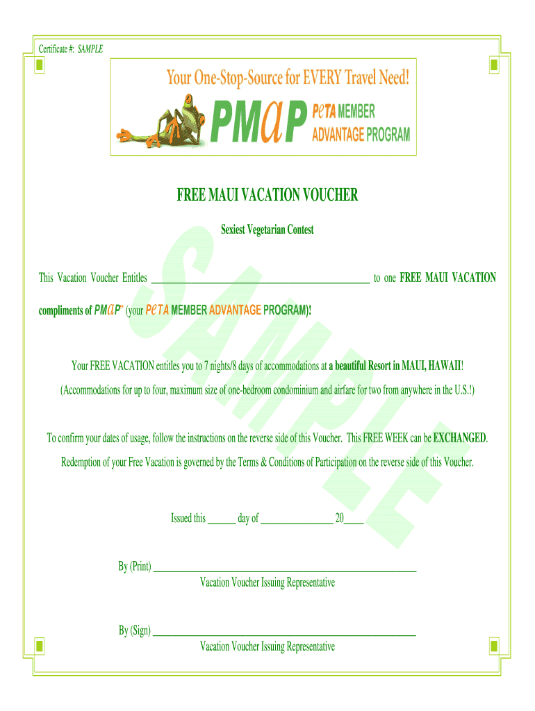 Certificate #: SAMPLE FREE MAUI VACATION VOUCHER The Sexiest Vegetarian Contest This Vacation Voucher Entitles to one FREE MAUI Vacations an e compliments of PM P (your P TA MEMBER ADVANTAGE PROGRAM)!