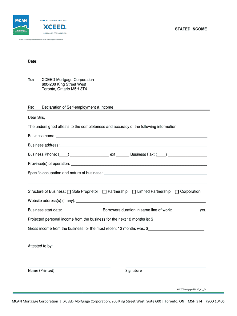 STATED INCOME Date: To: EXCEED Mortgage Corporation 600200 King Street West Toronto, Ontario M5H 3T4 Re: Declaration of Self employment & Income Dear Sirs, The undersigned attests to the completeness