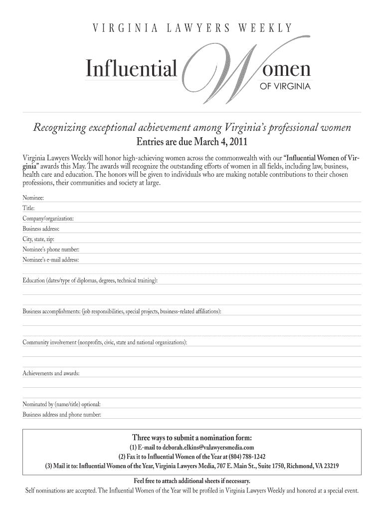 VIRGINIA LAWYERS WEEKLY Recognizing exceptional achievement among Virginia’s professional women Entries are due March 4, 2011, Virginia Lawyers Weekly will honor high-achieving women across the