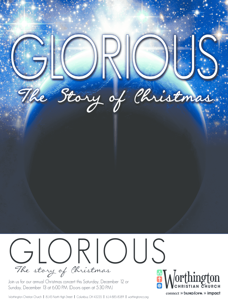 GLORIOUS The story of Christmas Join us for our annual Christmas concert this Saturday, December 12 or Sunday, December 13 at 6:00 PM. (Doors open at 5:30 PM.) Worthington Christian Church 8145 North