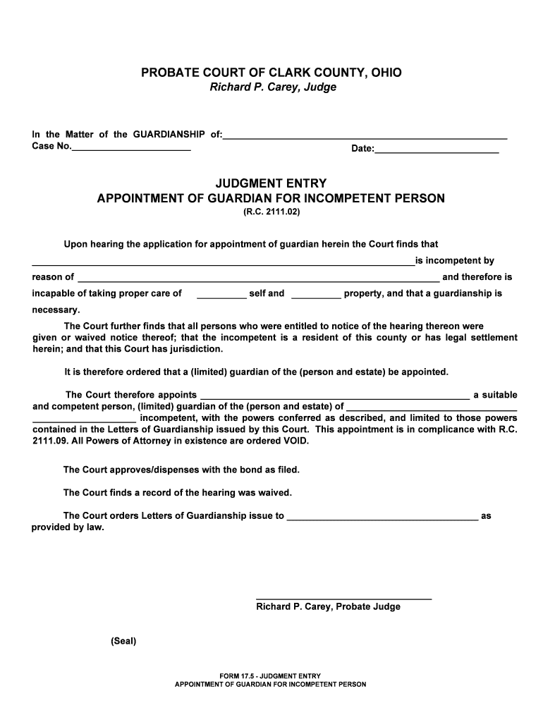 Print Form PROBATE COURT OF CLARK COUNTY, OHIO Richard P. Carey, Judge In the Matter of the GUARDIANSHIP of: Case No. Date: JUDGMENT ENTRY APPOINTMENT OF GUARDIAN FOR INCOMPETENT PERSON (R.C. 2111.02)