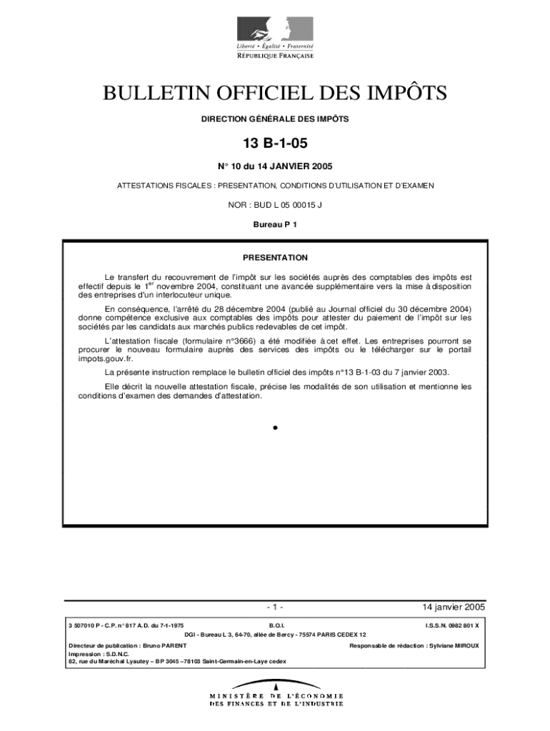 BULLETIN OFFICIAL DES IMPS DIRECTION GRALE DES IMPTS13 B105 N 10 Du 14 JANVIER 2005 ATTESTATIONS FISCALS : PRESENTATION, CONDITIONS UTILIZATION ET DEMEANOR : BUD L 05 00015 J Bureau P 1PRESENTATION