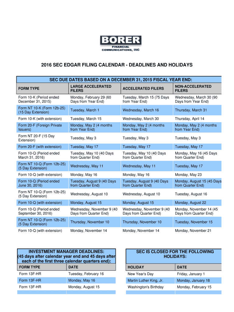 Get the free 2016 SEC EDGAR FILING CALENDAR - DEADLINES AND HOLIDAYS