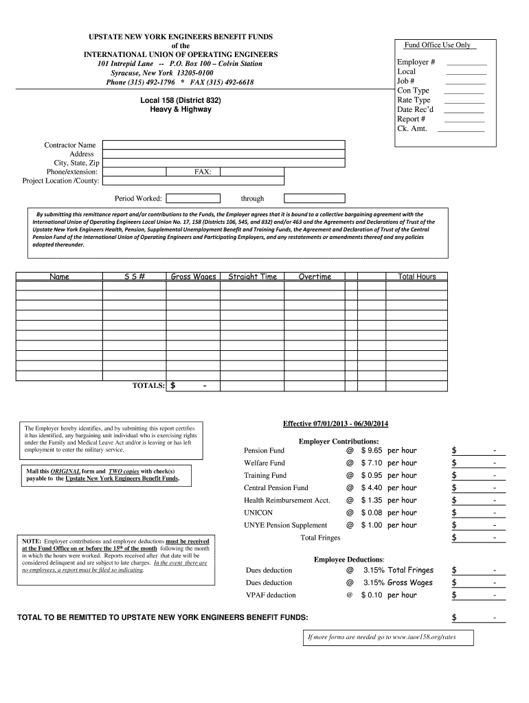 UPSTATE NEW YORK ENGINEERS BENEFIT FUNDS of the INTERNATIONAL UNION OF OPERATING ENGINEERS 101 Intrepid Lane P.O. Box 100 Colvin Station Syracuse, New York 132050100 Phone (315× 4921796 * FAX (315×