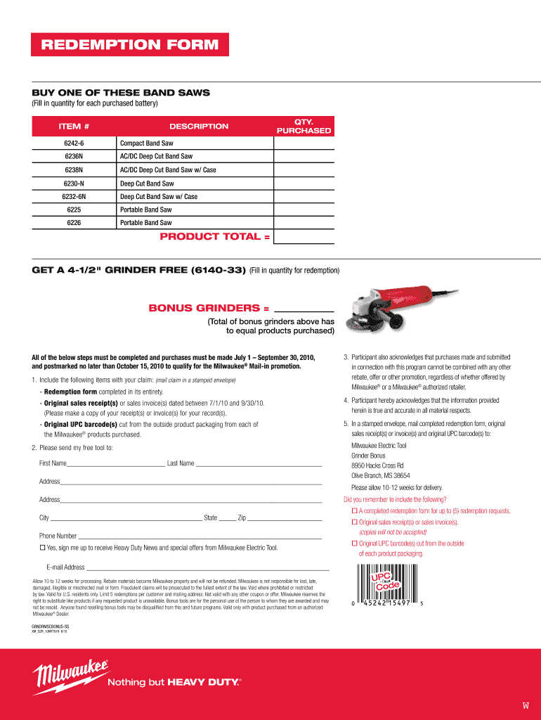 Redemption form BUY One of these band saws (Fill in quantity for each purchased battery) ITEM # DESCRIPTION 62426 Compact Band Saw 6236 N AC×DC Deep Cut Band Saw 6238 N AC×DC Deep Cut Band Saw