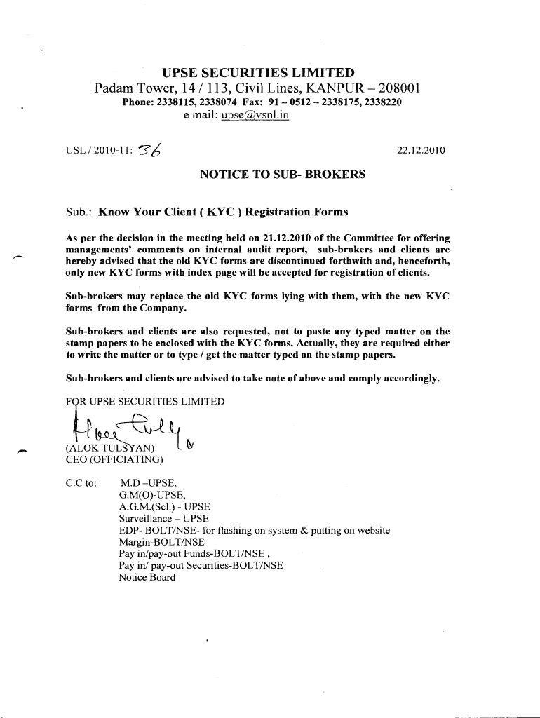 USE SECURITIES LIMITED Adam Tower, 14 × 113, Civil Lines, KANPUR 208001 Phone: 2338115,2338074 Fax: 91 0512 2338175,2338220 e-mail: use SNL.in NOTICE TO SUB BROKERS Sub.: Know Your Client (KYC) Registration