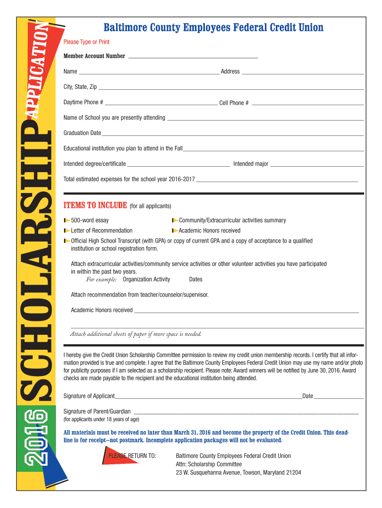 Please Type or Print Member Account Number Name Address City, State, Zip Daytime Phone # Cell Phone # Name of School you are presently attending 2016 SCHOLARSHIP APPLICATION N Baltimore County Employees