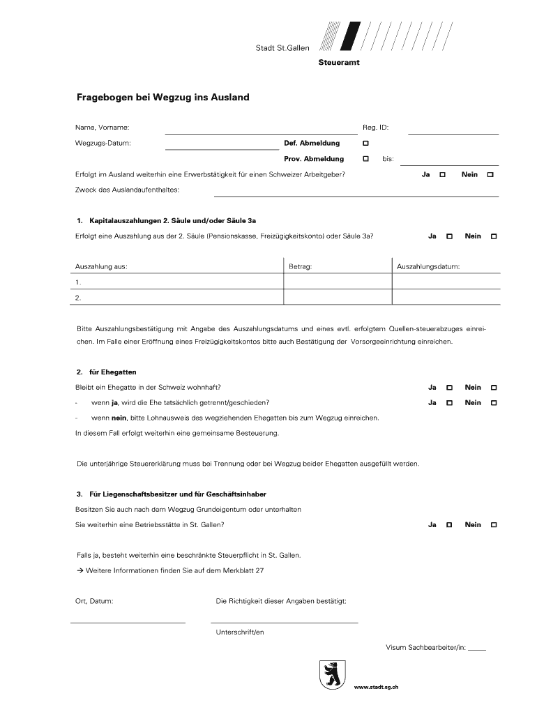 Holen Sie sich kostenlos Fragebogen bei Wegzug ins Ausland - stadtsgch - stadt sg
