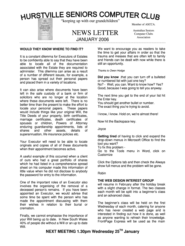 Keeping up with our grandchildren Member of ASPCA. Newsletter JANUARY 2006 WOULD THEY KNOW WHERE TO FIND IT? It is a constant dilemma for Executors of Estates to be confidently able to say that they