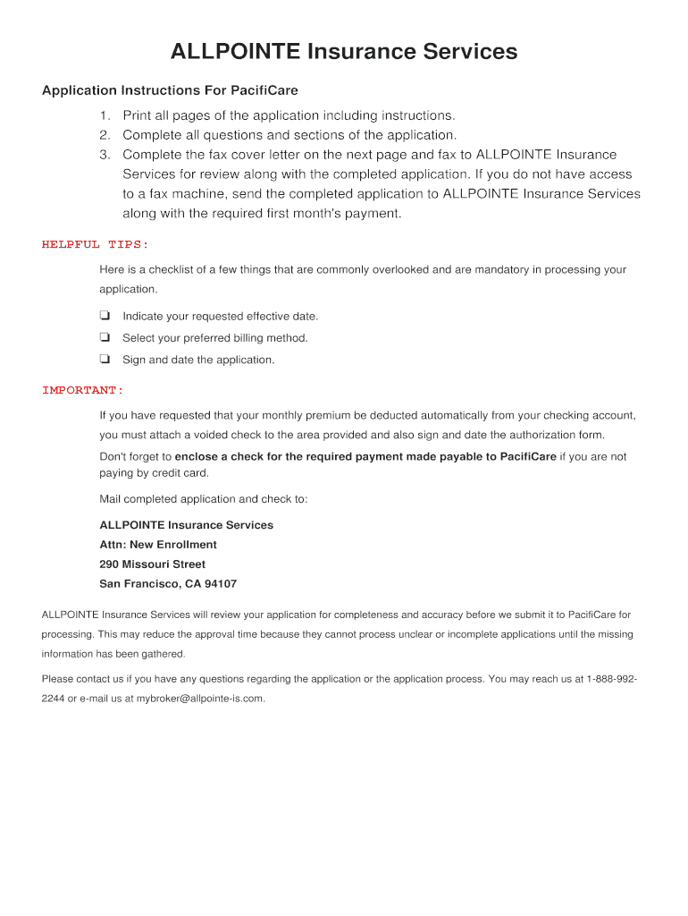 The completed PacifiCare application must be sent to ALLPOINTE Insurance Services for review before it is forwarded to PacifiCare. Check with ALLPOINTE for their submission methods, which may include mail or email.
