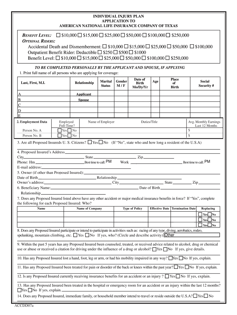 The Injury Insurance Plan Application is a healthcare form used by individuals to apply for coverage under an inpatient medical expense plan that offers benefits for injuries.