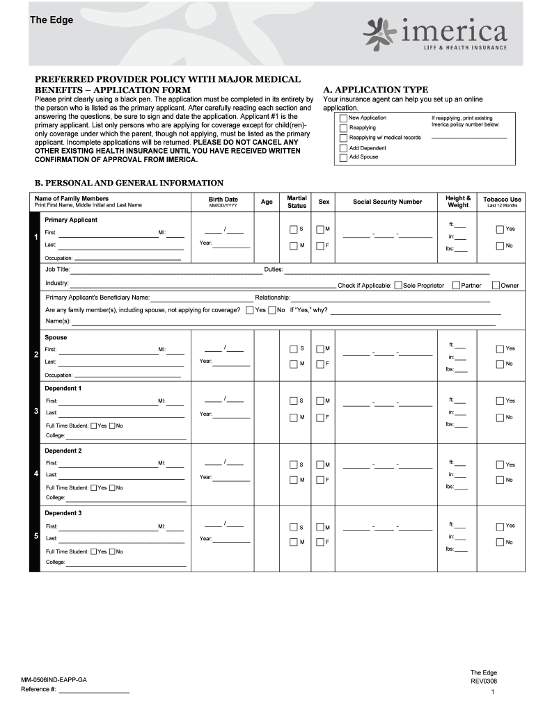 The Edge Health Insurance Application Form is a healthcare document used by individuals and families to apply for major medical benefits coverage.