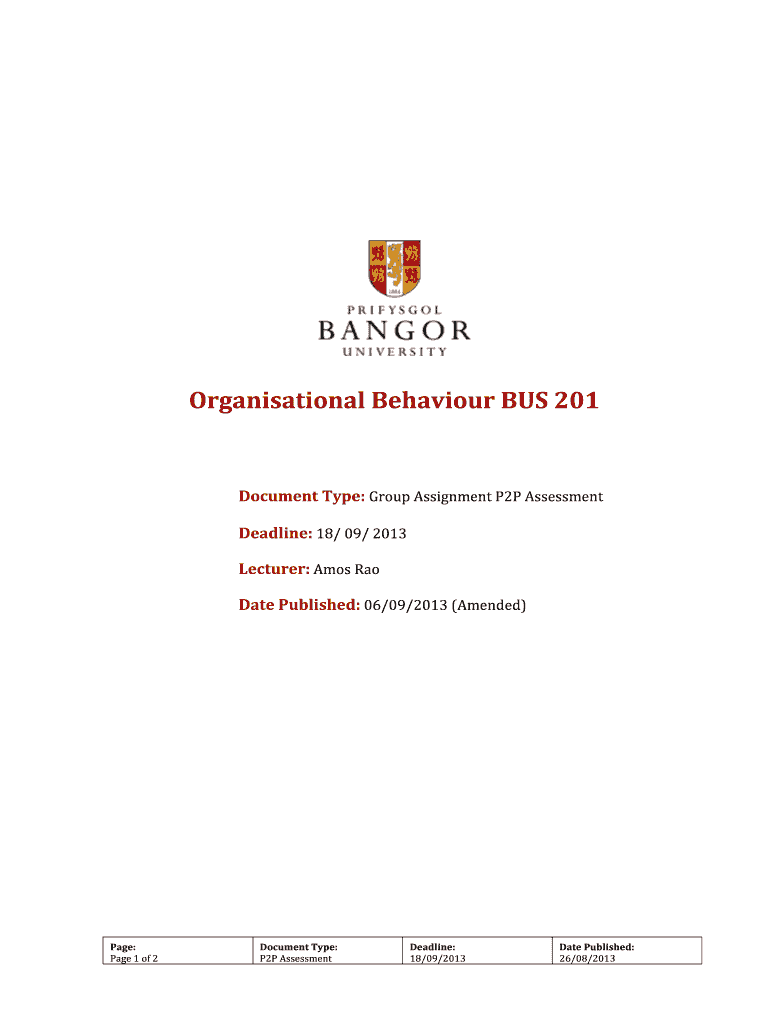 Organizational Behavior BUS 201 Document Type: Group Assignment P2P Assessment Deadline: 18× 09× 2013 Lecturer: Amos Ran Date Published: 06×09/2013 (Amended) Page: Page 1 of 2 Document Type: P2P