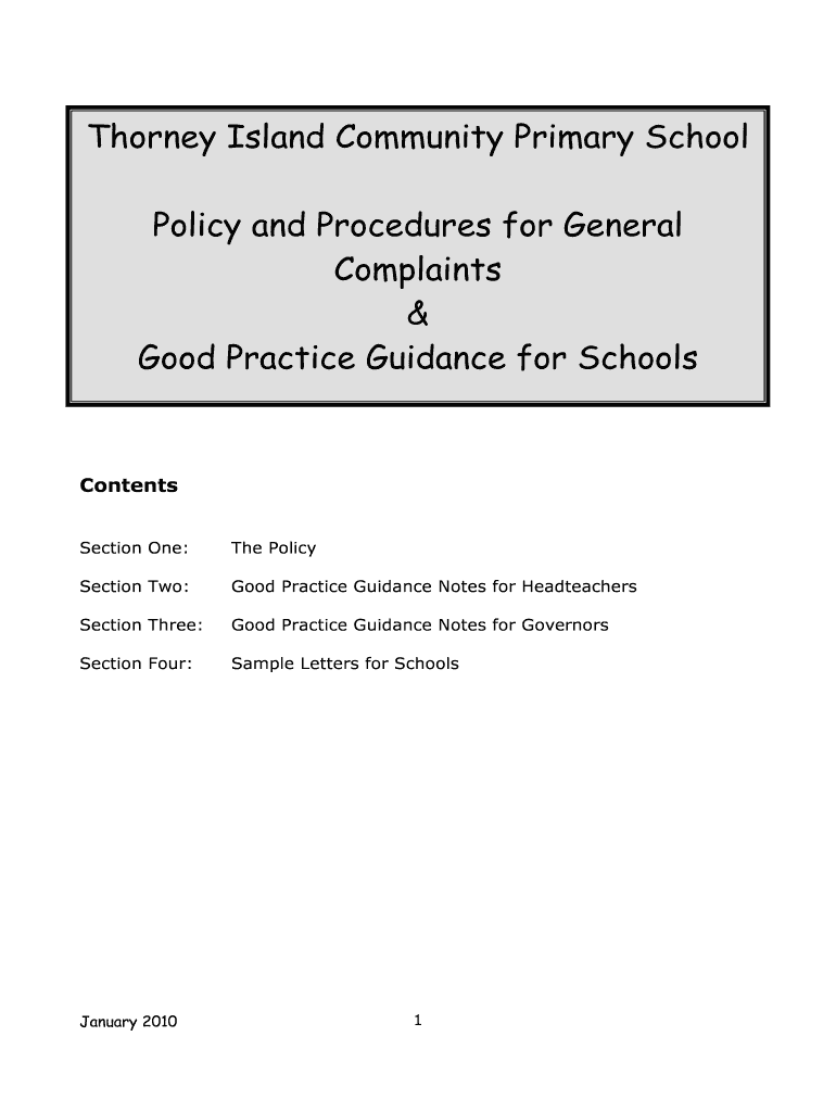 Thorny Island Community Primary School Policy and Procedures for General Complaints & Good Practice Guidance for Schools Contents Section One: The Policy Section Two: Good Practice Guidance Notes