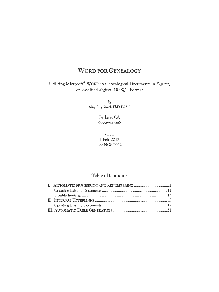 WORD FOR GENEALOGY Utilizing Microsoft WORD in Genealogical Documents in Register, or Modified Register NGS, Format by Ally Ray Smith PhD FAST Berkeley CA alvyray.com v1.11 1 Feb. 2012 For NGS 2012Table