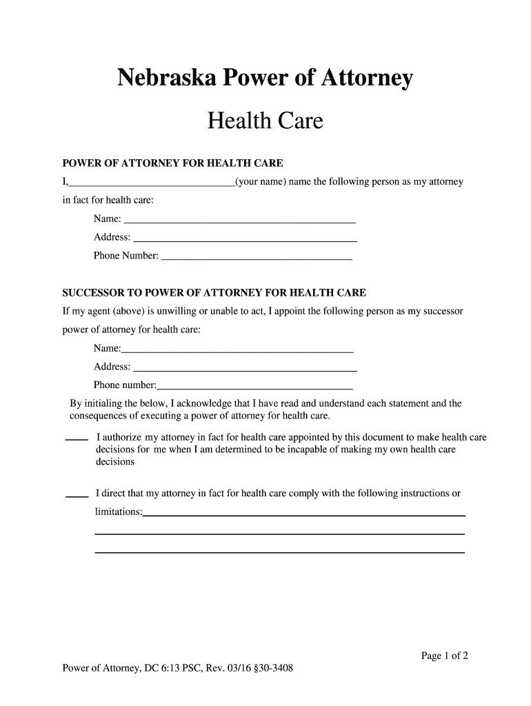 Nebraska Power of Attorney Health Care POWER OF ATTORNEY FOR HEALTH CARE I, (your name) name the following person as my attorney in fact for health care: Name: Address: Phone Number: SUCCESSOR TO