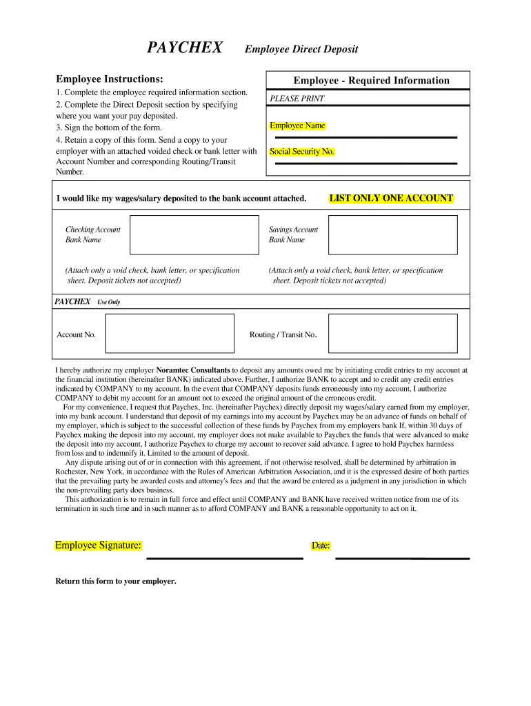 PAYCHEXEmployee Direct DepositEmployee Instructions:Employee Required Information1. Complete the employee required information section. 2. Complete the Direct Deposit section by specifying where you