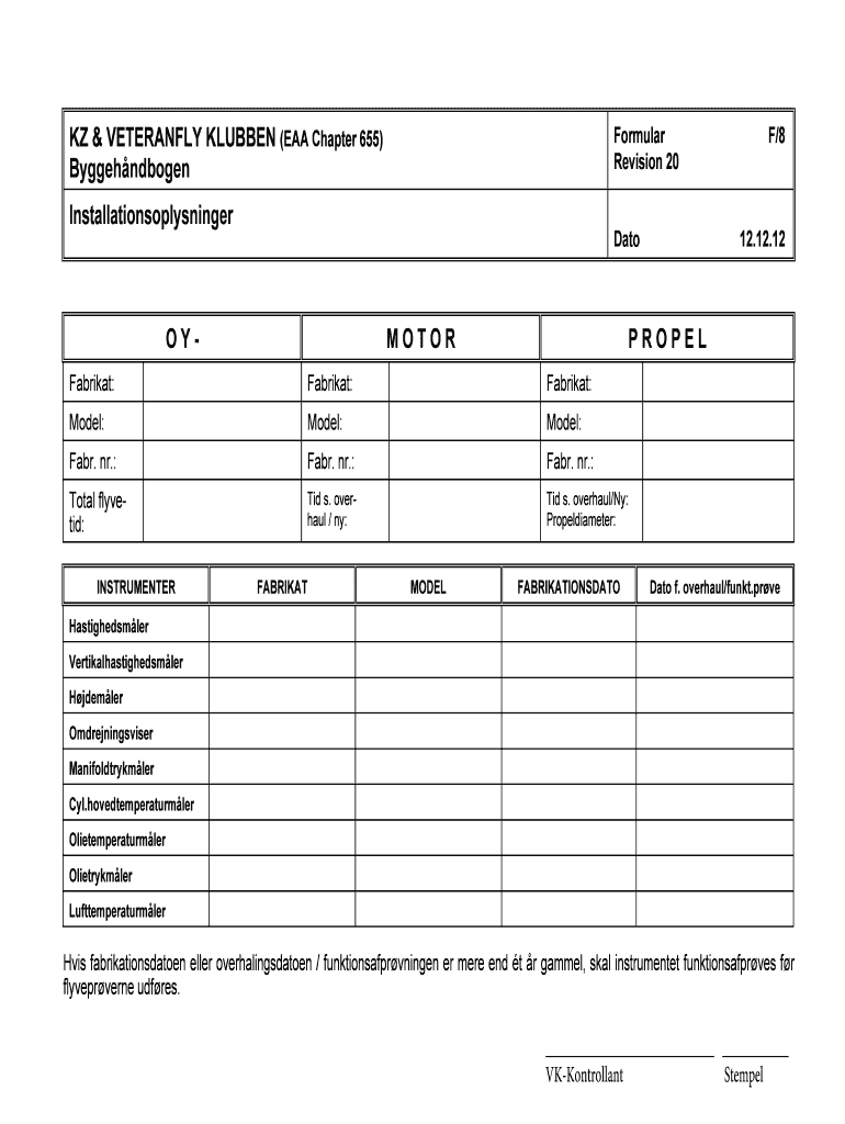 KZ & VETERAN BLUBBER (EAA Chapter 655) Byggehndbogen Formula Revision 20 Installationsoplysninger 12.12.12 Data OF MOTOR F×8 PROPEL Fabricate: Fabricate: Fabricate: Model: Model: Model: Far. NR.: