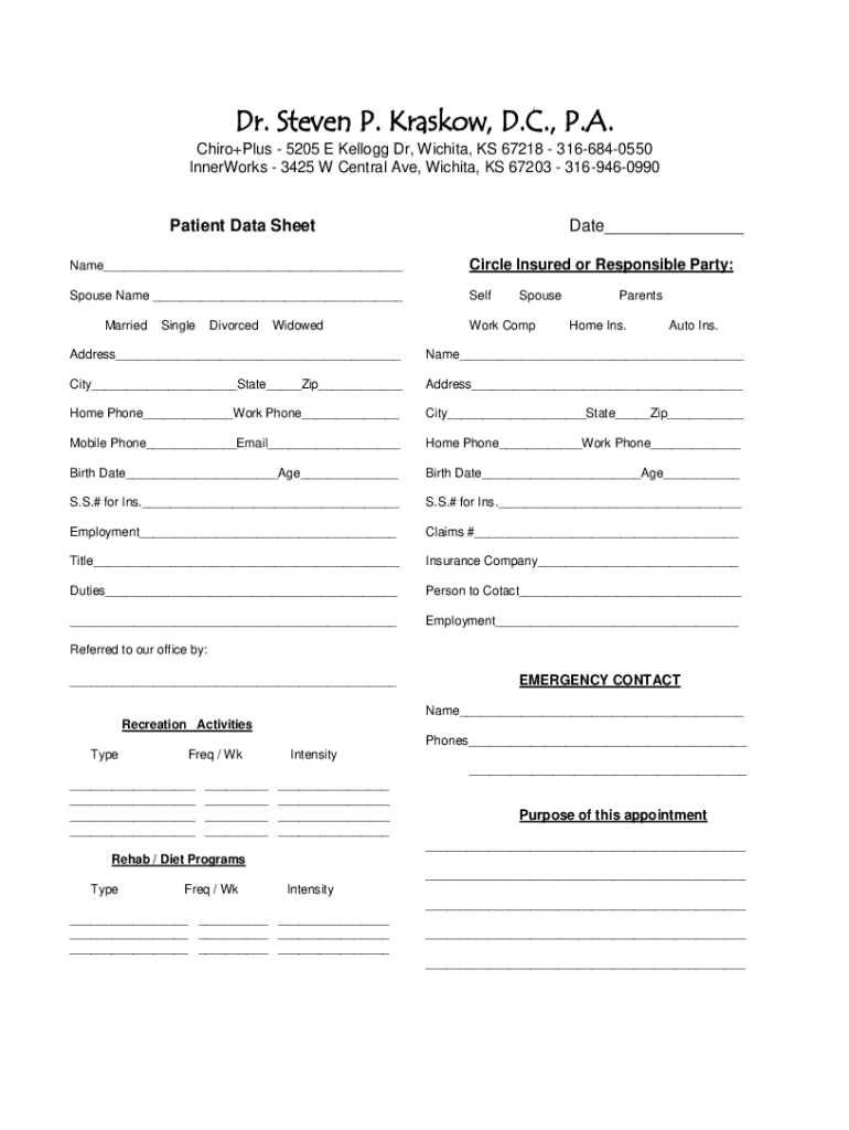 The Patient Data Sheet should be completed by all patients entering treatment at a chiropractic office to provide necessary medical history and personal information.