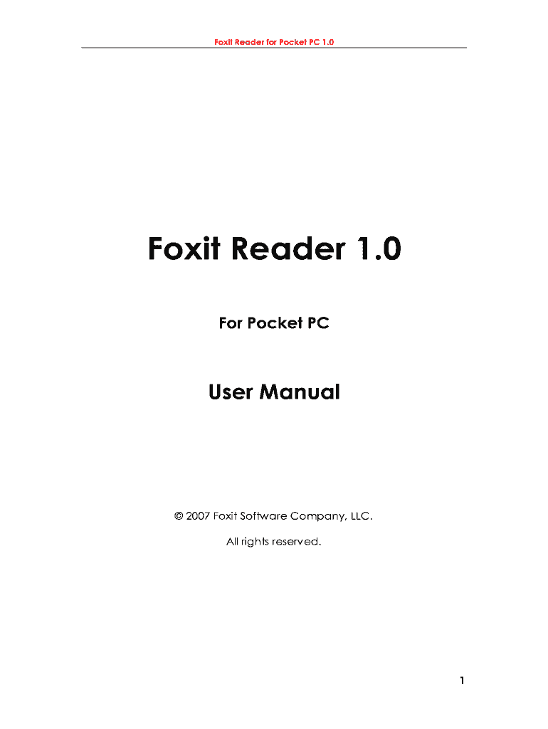 This document is the user manual for Foxit Reader 1.0 for Pocket PC, detailing its functionalities, installation procedures, usage instructions, and licensing agreements.