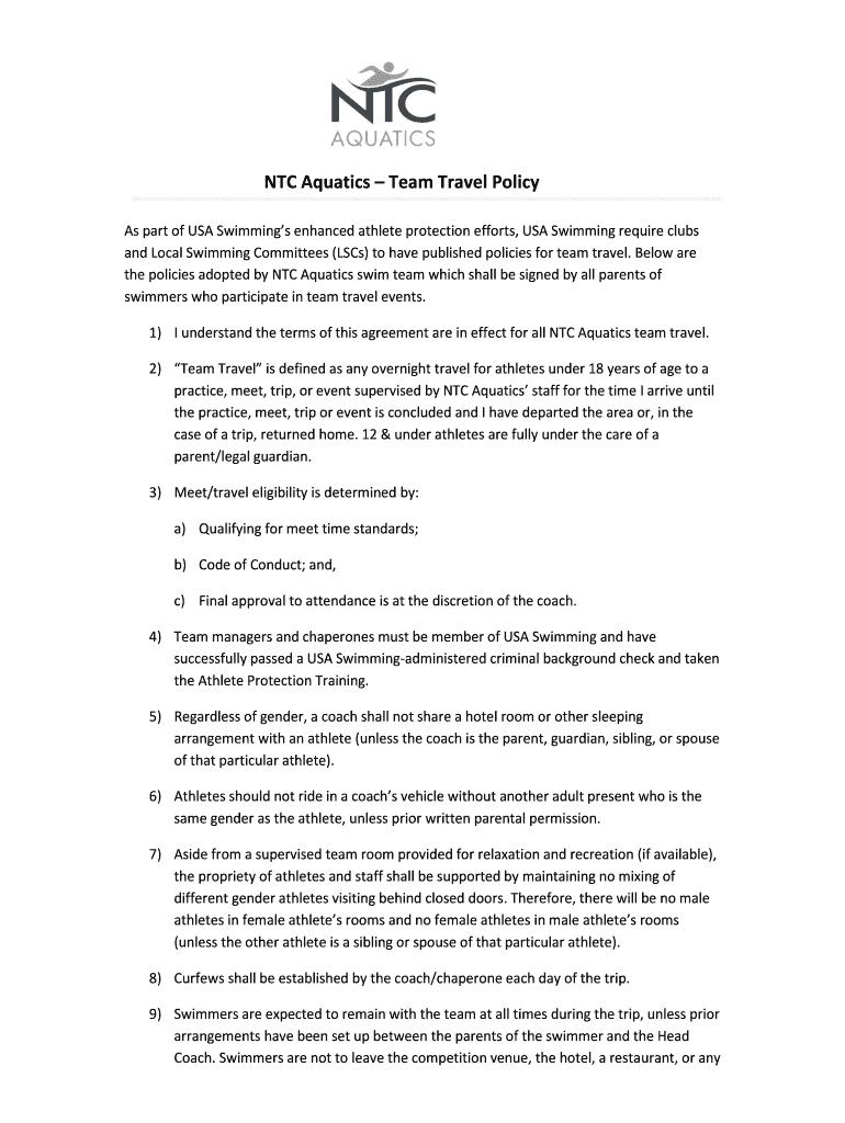 NTC Aquatics Team Travel Policy As part of USA Swimming enhanced athlete protection efforts, USA Swimming require clubs and Local Swimming Committees (LCS) to have published policies for team travel.