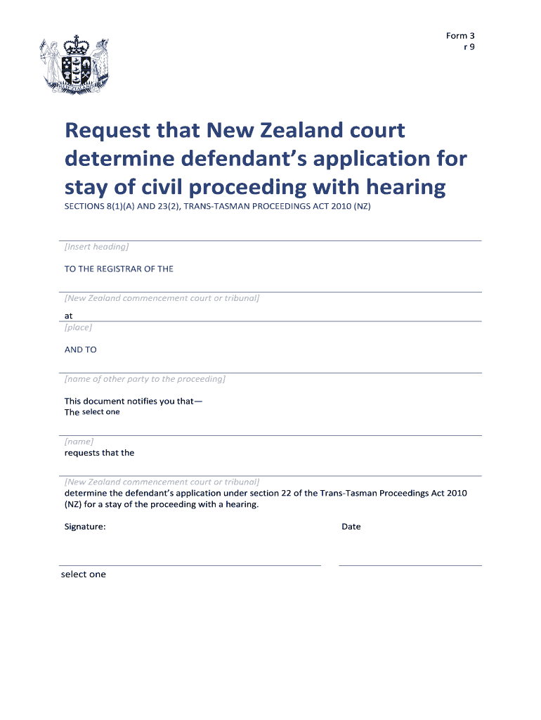 Form 3 r9 Request that New Zealand court determine defendants application for stay of civil proceeding with hearing SECTIONS 8×1)(A) AND 23×2), TRANSTASMAN PROCEEDINGS ACT 2010 (NZ) Insert heading