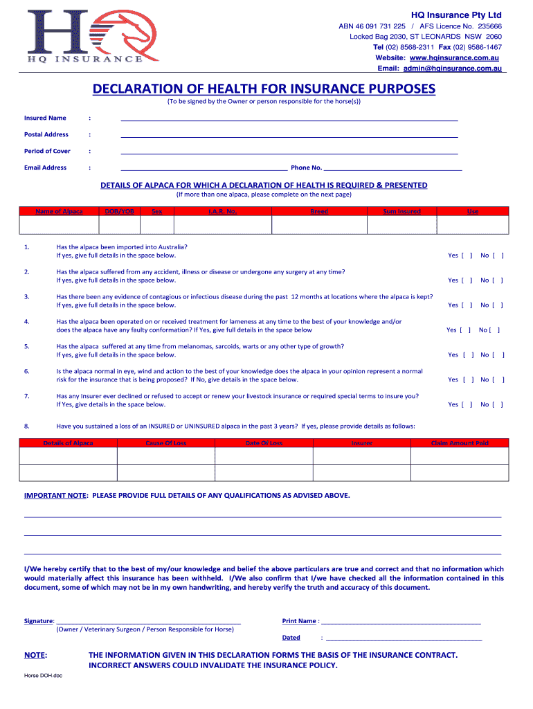 Get the free Declaration of health for insurance purposes - HQ Insurance