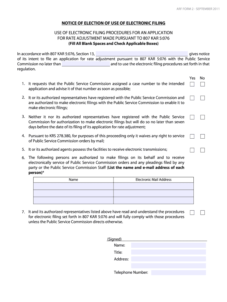ARF FORM 2 SEPTEMBER 2011 NOTICE OF ELECTION OF USE OF ELECTRONIC FILING USE OF ELECTRONIC FILING PROCEDURES FOR AN APPLICATION FOR RATE ADJUSTMENT MADE PURSUANT TO 807 CAR 5:076 (Fill All Blank Spaces