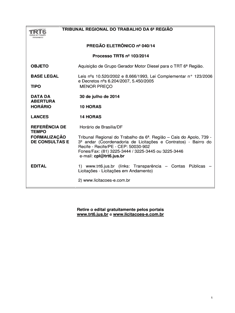 TRIBUNAL REGIONAL DO TRIBAL DA 6 REGION PRESO ELECTRIC n 040×14 Process TRT6 n 103×2014 OBJECT Aquino de Grupo Grader Motor Diesel para o TRT 6 Region. BASE LEGAL Leis NS 10.520×2002 e 8.666×1993,