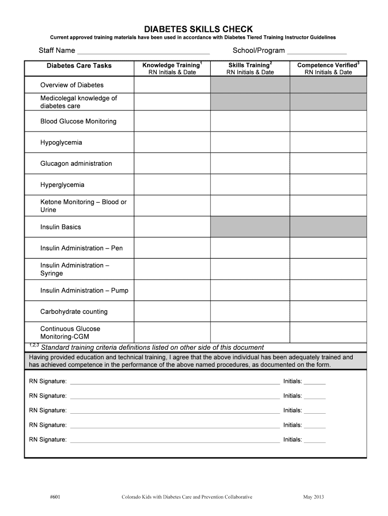 DIABETES SKILLS CHECK Current approved training materials have been used in accordance with Diabetes Tiered Training Instructor GuidelinesStaff Homeschool×Program Knowledge Training1 RN Initials