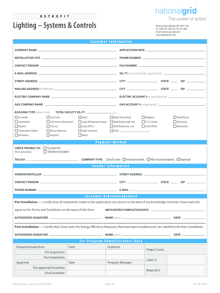This document outlines the Retrofit Program aimed at commercial and industrial customers for replacing inefficient equipment with energy-efficient technologies. It includes application details, eligibility
