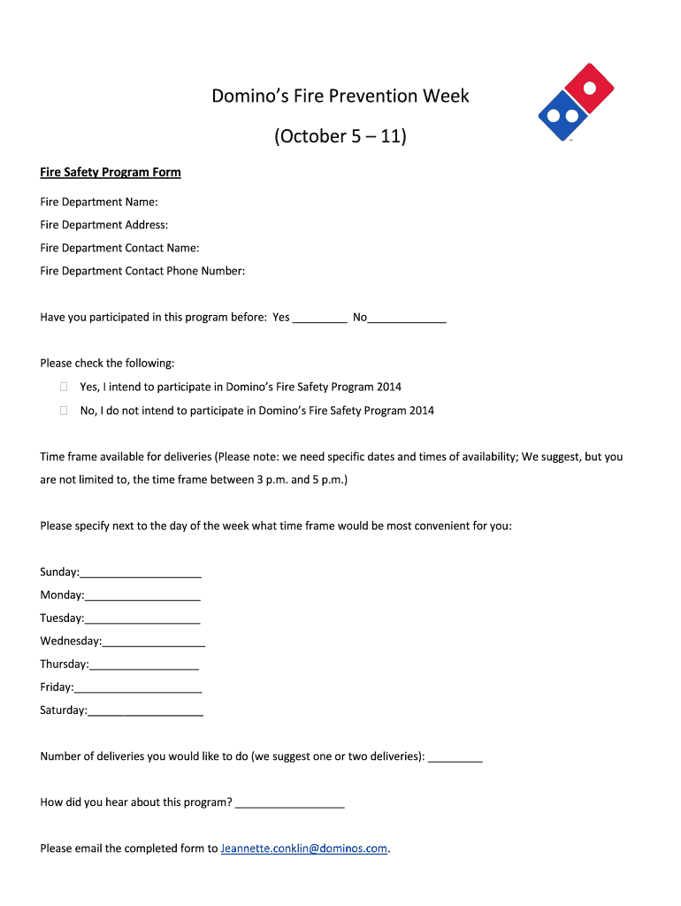 Dominos Fire Prevention Week (October 5 11) Fire Safety Program Form Fire Department Name: Fire Department Address: Fire Department Contact Name: Fire Department Contact Phone Number: Have you participated